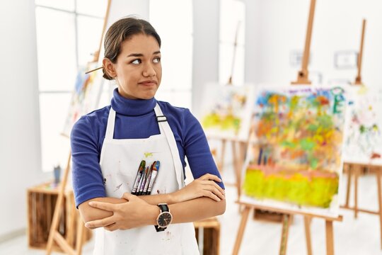 Young brunette woman at art studio looking to the side with arms crossed convinced and confident
