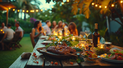 Amidst the relaxed ambiance of a backyard dinner party, a long table overflows with sumptuous grilled BBQ meat, colorful salads, and bottles of wine. Friends and family engage