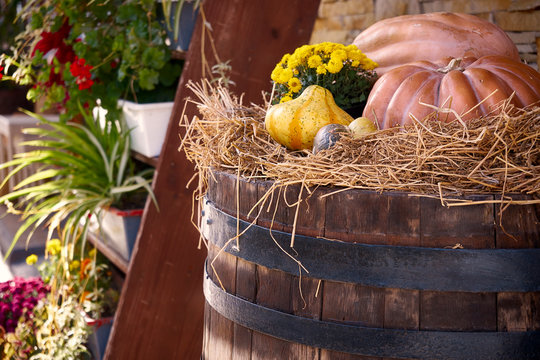 beautiful ripe orange pumpkin lying in the straw on a wooden barrel
