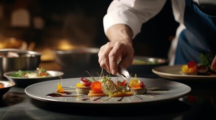 Master chef cook man hands precisely cooking dressing preparing tasty fresh delicious mouthwatering gourmet dish food on plate to customers 5-star michelin restaurant kitchen close-up detailed artwork