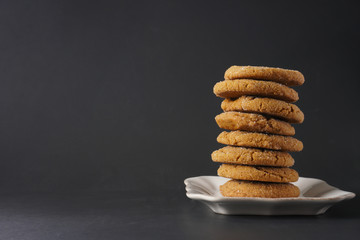 Anzac biscuits stacked neatly on a white plate, traditional oat and golden syrup cookies.