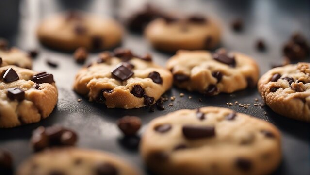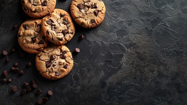 Delicious chocolate chip cookies on dark background