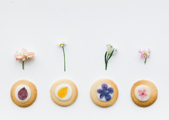 sweet french macarons with a bouquet of lilies - wallpaper concept with copyspace for text