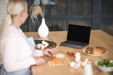 Mature women cooking and preparing fresh vegetables in modern kitchen