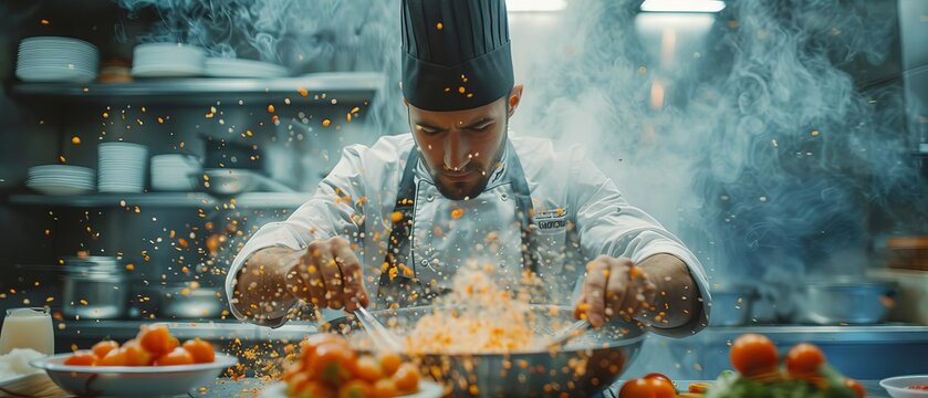 Chef expertly preparing gourmet pasta with vegetables