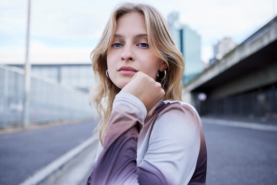 Woman in city street, fashion portrait for blonde model and gen z style in New York road. Outdoor winter clothes, natural makeup beauty on face and cool caucasian girl closeup in urban lifestyle