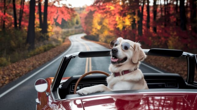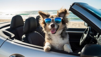 vacation concept, cool dog wearing sunglasses, sticking its head out of a car window, enjoying breeze and adventure of open road