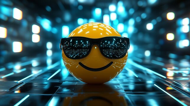 A cool sunglasses emoji with reflective black shades, its shiny yellow face glowing against a futuristic background.
