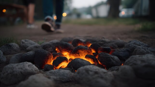 Glowing embers radiate warmth from a stone circle fire pit at dusk as blurred figures walk away in the cool evening air