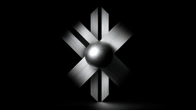 Silver X-shaped cross logo with a sphere in the center, black background, vector graphics, minimalism, elegant design, metallic finish, metallic shine.