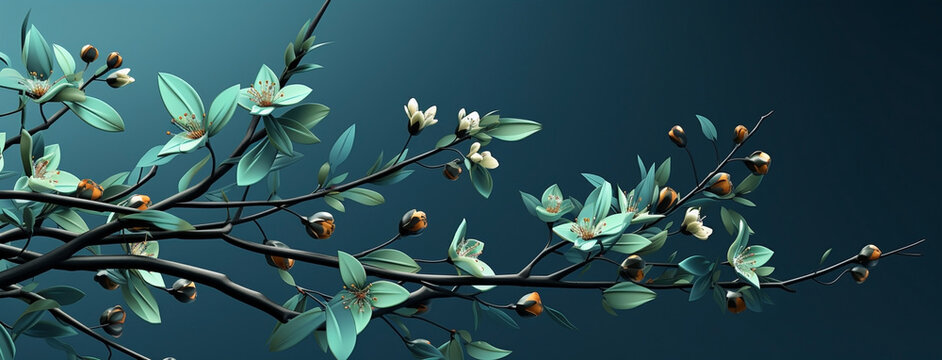 Beautiful wide panoramic plant branch with small flowers and leaves, wallpaper banner in blue color background
