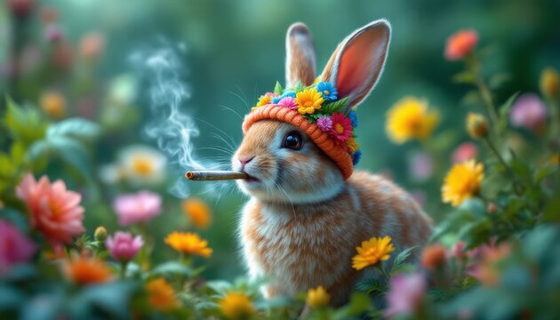 Cute Rabbit in Flower Hat Smoking a Cigarette in Garden