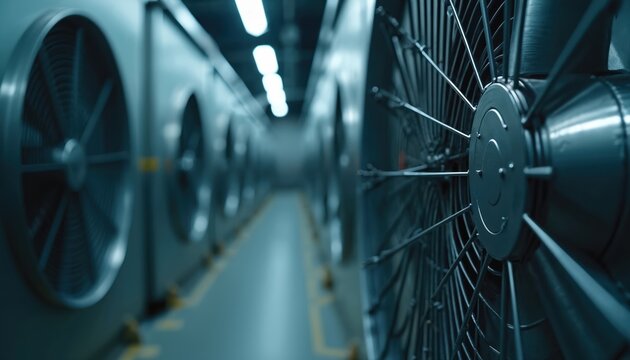 Rows of industrial ventilation fans line a long corridor. Large metal turbines create airflow for cooling systems in a large building or factory. Equipment provides climate control.