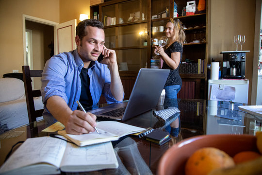 ragazzo chiaro in camicia e abbigliamento casual lavora in smart working da casa e sullo sfondo la sua compagna che ordina