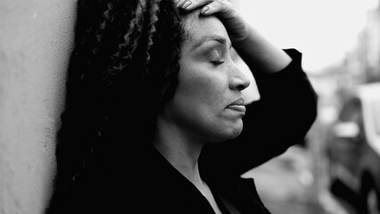 Concerned African American middle-aged woman suffering in quiet despair outdoors in urban environment, person coping with mental anxiety, struggling with modern life, black and white