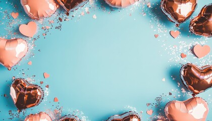 Rose gold heart shaped balloons and confetti frame a light blue background for celebratory messaging.