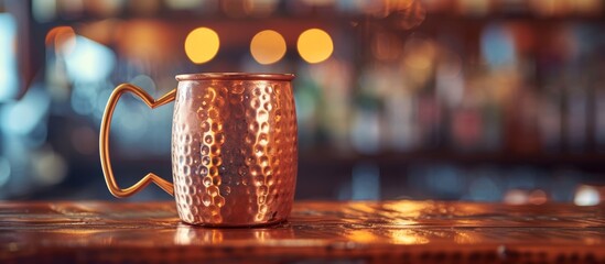 Shiny copper mug elegantly placed on a stylish bar counter in a trendy cocktail lounge