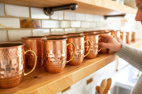 Front view kitchen with marble kitchen countertop coffee mugs and copper hammered cups on it under warm morning sunshine, ceramic small diamond tiles wall, 3d Rendering
