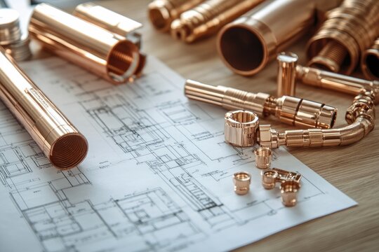 Close-up of copper plumbing pipes showcasing industrial design and functionality.