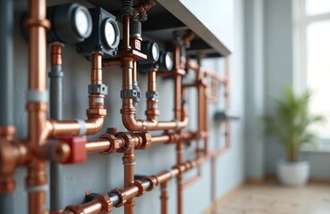 Close-up of heating installation system with copper pipes. Modern central boiler heating system on gray wall in house. Plumbing, industrial interior. Energy efficiency, saving gas, new technology.