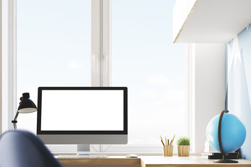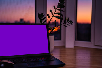 A laptop with an empty green screen on a wooden table at night with a view of the city with colored lights. A place for text, the concept of programming and development