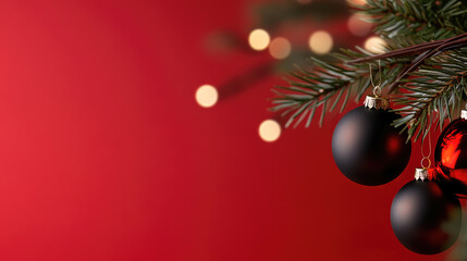 Small evergreen Christmas tree is decorated with red festive ornaments, standing on a glittery surface with soft, glowing red bokeh lights in the background, offering copy space