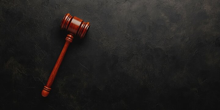 Top view of a wooden judge's gavel positioned diagonally on a dark textured background with ample copy space in the bottom right corner