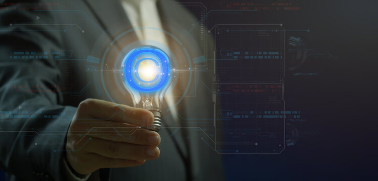 Copyright symbol for author rights and patented intellectual property. Copyleft trademark license. Copyright or patent concept. Businessman showing glowing neon line of copyright icon.