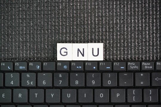A laptop keyboard with GNU words. operating system composed of free software, developed by the GNU Project.