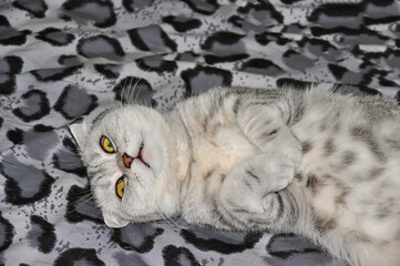Gray striped cat lies in a funny pose with a funny expression of the muzzle close-up