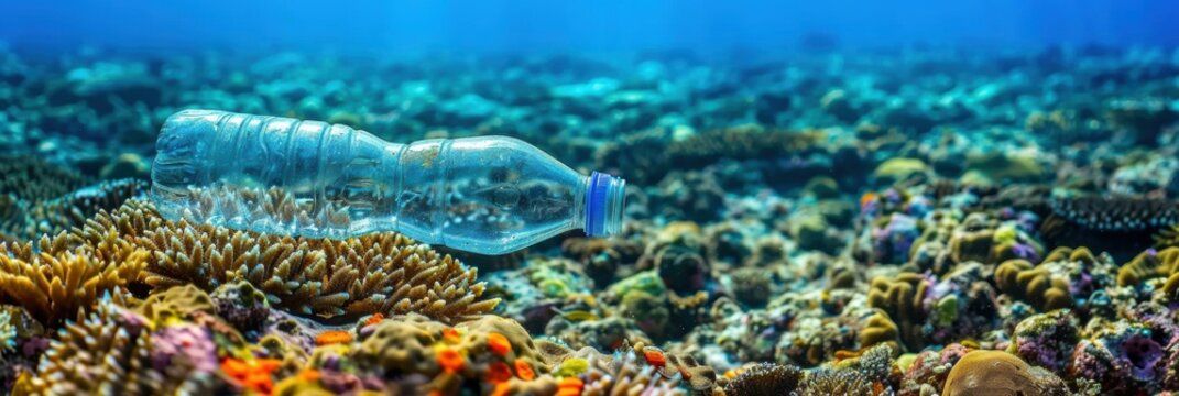 A plastic bottle floats over a coral reef. AI.