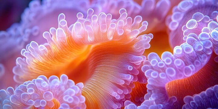 Top view texture of ruffled coral polyps swaying gently in an underwater current, forming a vibrant tapestry of colors and shapes on a coral reef