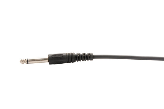Guitar audio jack with black cable isolated on white background.