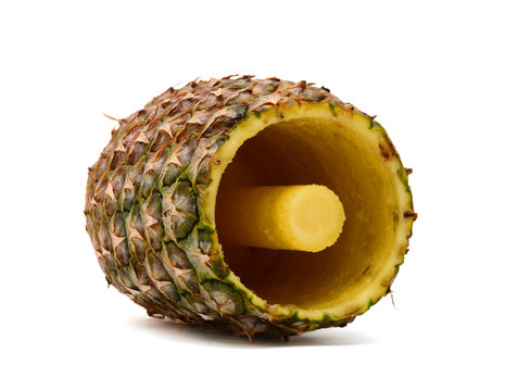 A pineapple has been cored and sliced using a corer and slicer utensil