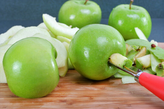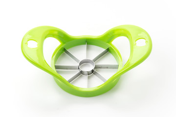 Apple Corer with Sliced Apples and Apple Core on a Two-Tone Background for Fruit Preparation and Healthy Eating
