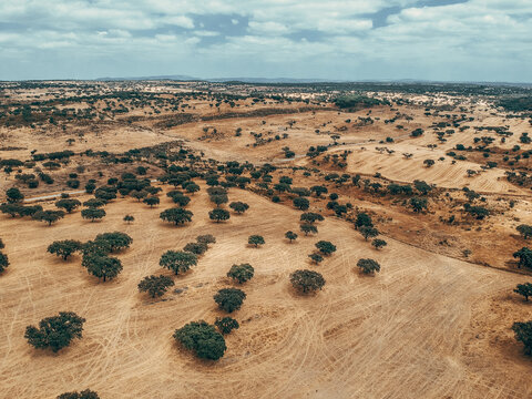cork oaks forest field in Alentejo, portugal aerial shot