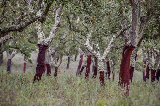 Cork oak forest in the rays of the setting sun. Production of natural cork from cork oak bark, winemaking