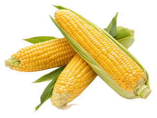 Fresh ripe corn cobs with green leaves. Harvest Vegetables. Top View. Organic natural food. Isolated. PNG.