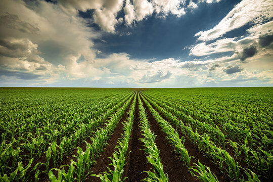 Expansive view of a green corn field stretching into the horizon under a dramatic cloudy sky
