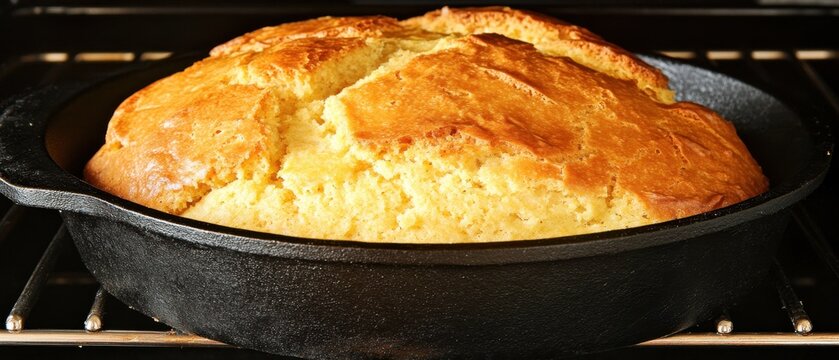 Golden cornbread baking in a cast iron skillet inside a kitchen oven with warm light and rustic charm presenting a delicious homemade culinary experience and traditional comfort food