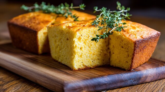 Close Up of Golden Cornbread Slice with Whipped Cream and Greens on Wood Board