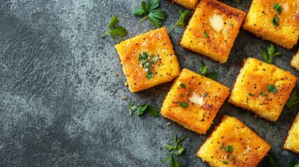 Close up of cornbread squares with melted butter, isolated on a textured gray surface with minimal garnish