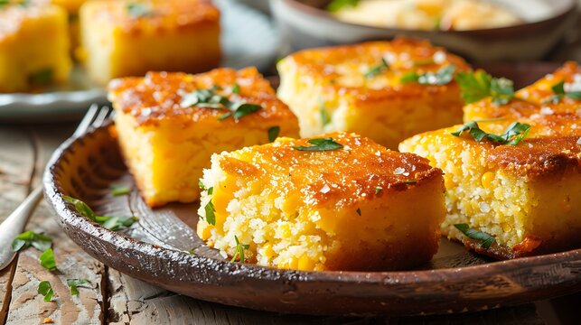 Close up of a plate of golden cornbread squares, freshly baked and sprinkled with parsley, ready to be enjoyed. The warm, rustic setting enhances the appeal of this homemade treat.