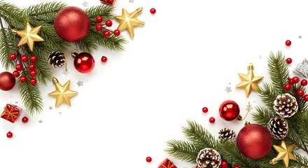 Festive christmas corner decorations with evergreen branches ornaments and pine cones