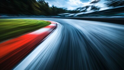 The image shows a race car speeding around a corner of a racetrack with green grass and trees in the background.