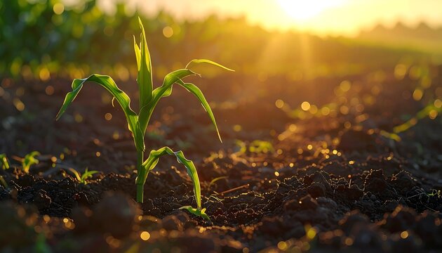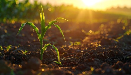 Close-up of a young cornstalk bathed in golden sunlight. The plant emerges from rich soil with blurred field background