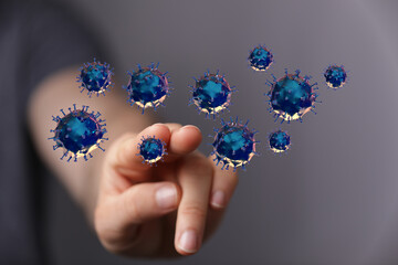 An image with artistic representation of virus molecules near finger, symbolizing interaction and concepts of