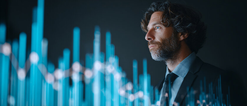 A focused businessman analyzing dynamic data trends on a digital display, representing strategic thinking and decision-making in a modern corporate environment.
