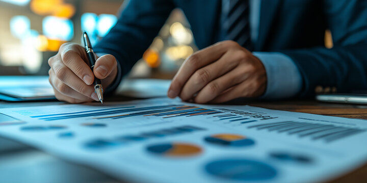 Dynamic financial growth chart with glowing blue lines and ascending bars, illustrating market trends and successful investment strategies against a blurred office.