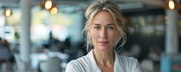 Senior businesswoman smiling in modern corporate office